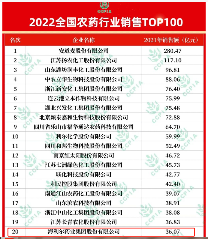 ? ? ? ?7月7日,第九屆農(nóng)藥行業(yè)經(jīng)濟(jì)運(yùn)行分析會暨2022農(nóng)藥行業(yè)名單發(fā)布會在浙江紹興召開。會上揭曉了2022農(nóng)藥行業(yè)名單,其中海利爾藥業(yè)集團(tuán)股份有限公司以36.07億元的銷售額,榮登2022全國農(nóng)藥行業(yè)銷售TOP100榜單第二十名。