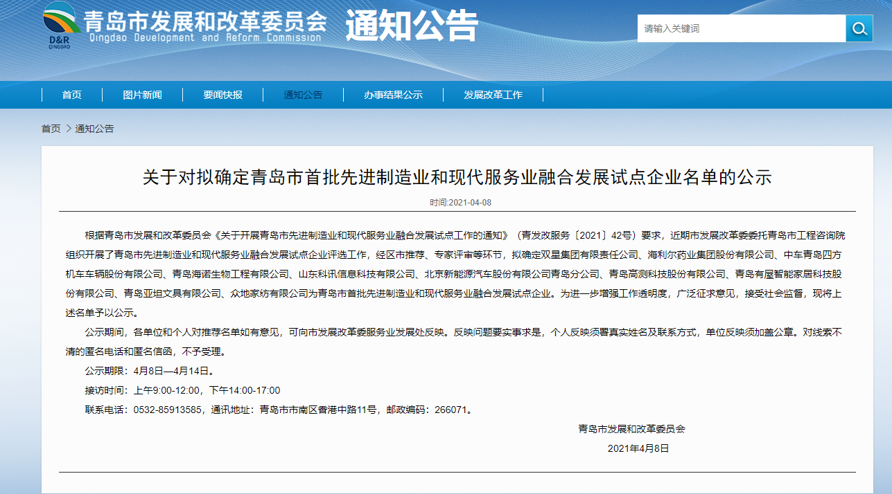 ? ? ? ?為貫徹落實《關(guān)于推動先進制造業(yè)和現(xiàn)代服務(wù)業(yè)深度融合發(fā)展的實施意見》精神,青島市發(fā)展和改革委員會在全市開展了先進制造業(yè)和現(xiàn)代服務(wù)業(yè)融合發(fā)展試點,以培育融合發(fā)展新業(yè)態(tài)新模式、探索重點行業(yè)重點領(lǐng)域融合發(fā)展新路徑、發(fā)揮多元化融合主體作用為主要任務(wù),為全市其他企業(yè)提供可復(fù)制可推廣的經(jīng)驗,推動區(qū)域服務(wù)經(jīng)濟高質(zhì)量發(fā)展。