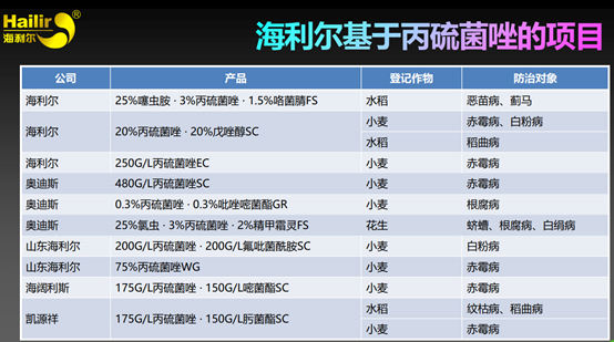 據(jù)葛堯倫董事長介紹,在2020年,海利爾的丙硫菌唑原藥正式投產(chǎn),現(xiàn)產(chǎn)2000噸/年,二期在設(shè)計推進(jìn) 6000噸/年自動化車間。目前海利爾基于丙硫菌唑具體有以下這些: