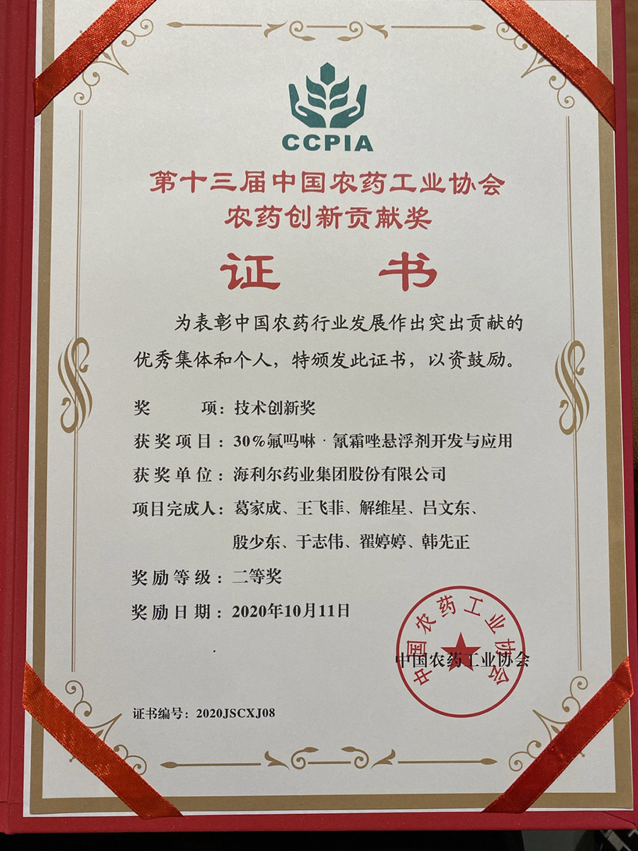 ????? ?10月11日,第十三屆中國(guó)農(nóng)藥工業(yè)協(xié)會(huì)農(nóng)藥創(chuàng)新貢獻(xiàn)獎(jiǎng)名單揭曉,海利爾藥業(yè)集團(tuán)股份有限公司榮獲技術(shù)創(chuàng)新獎(jiǎng)二等獎(jiǎng)。