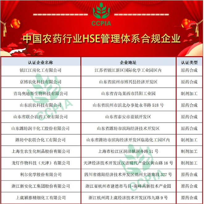 ???????10月11日,“中國(guó)農(nóng)藥行業(yè)HSE管理體系合規(guī)企業(yè)”名單發(fā)布,海利爾藥業(yè)集團(tuán)旗下子公司青島奧迪斯生物科技有限公司榜上有名。