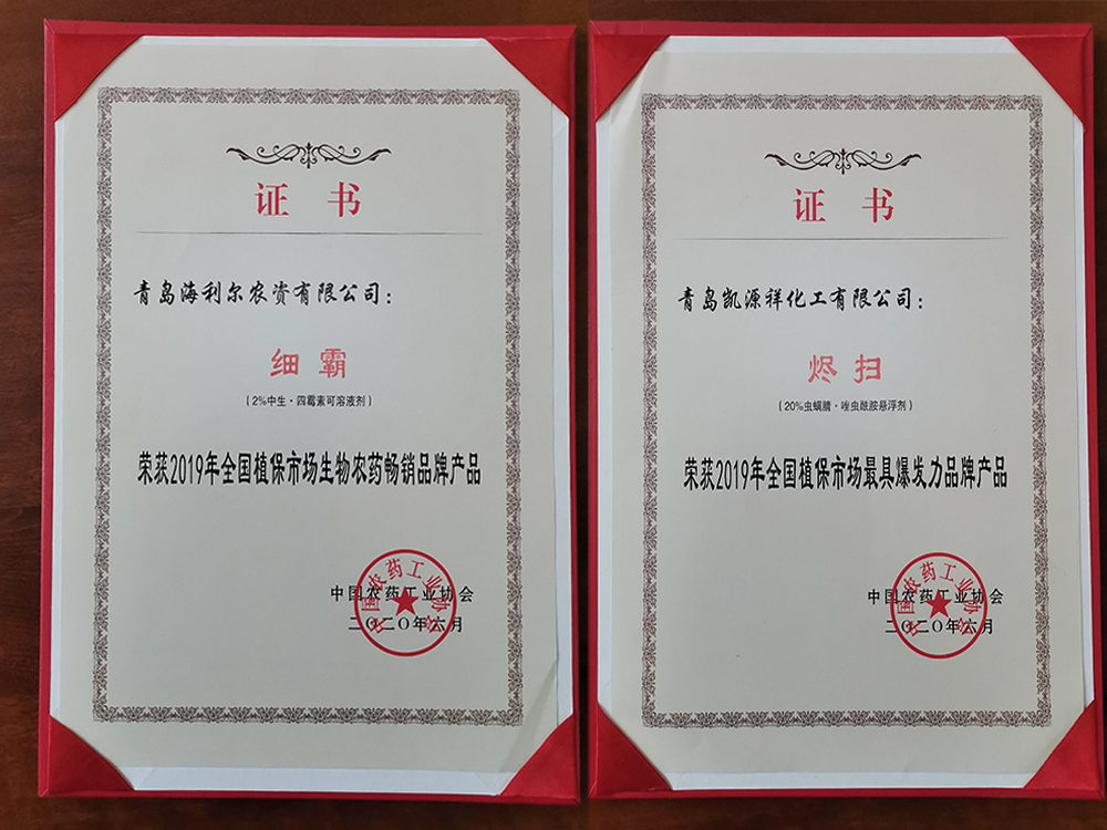 海利爾藥業(yè)集團(tuán)榮獲“2020全國(guó)農(nóng)藥行業(yè)銷(xiāo)售TOP100”第21名,細(xì)霸榮獲“2019年全國(guó)植保市場(chǎng)生物農(nóng)藥暢銷(xiāo)品牌產(chǎn)品”,燼掃榮獲“2019年全國(guó)植保市場(chǎng)最具爆發(fā)力品牌產(chǎn)品”,研發(fā)中心制劑所王春修榮獲“優(yōu)秀通訊員”稱(chēng)號(hào)。