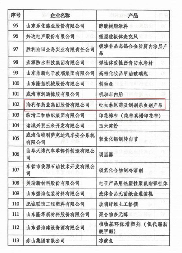 2019年12月31日,山東省工業(yè)和信息化廳、山東省工業(yè)聯(lián)合會聯(lián)合發(fā)布公示,海利爾藥業(yè)集團股份有限公司等125家企業(yè)榮獲山東省第三屆制造業(yè)“單項冠軍”企業(yè)榮譽稱號。