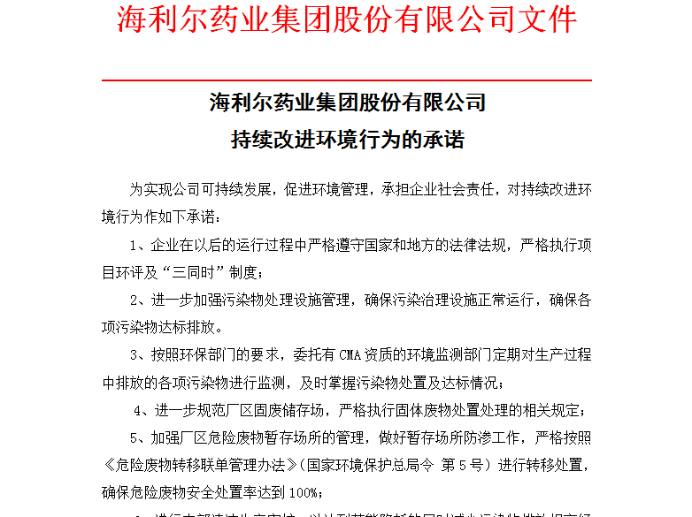 海利爾藥業(yè)集團(tuán)持續(xù)改進(jìn)環(huán)境行為的承諾