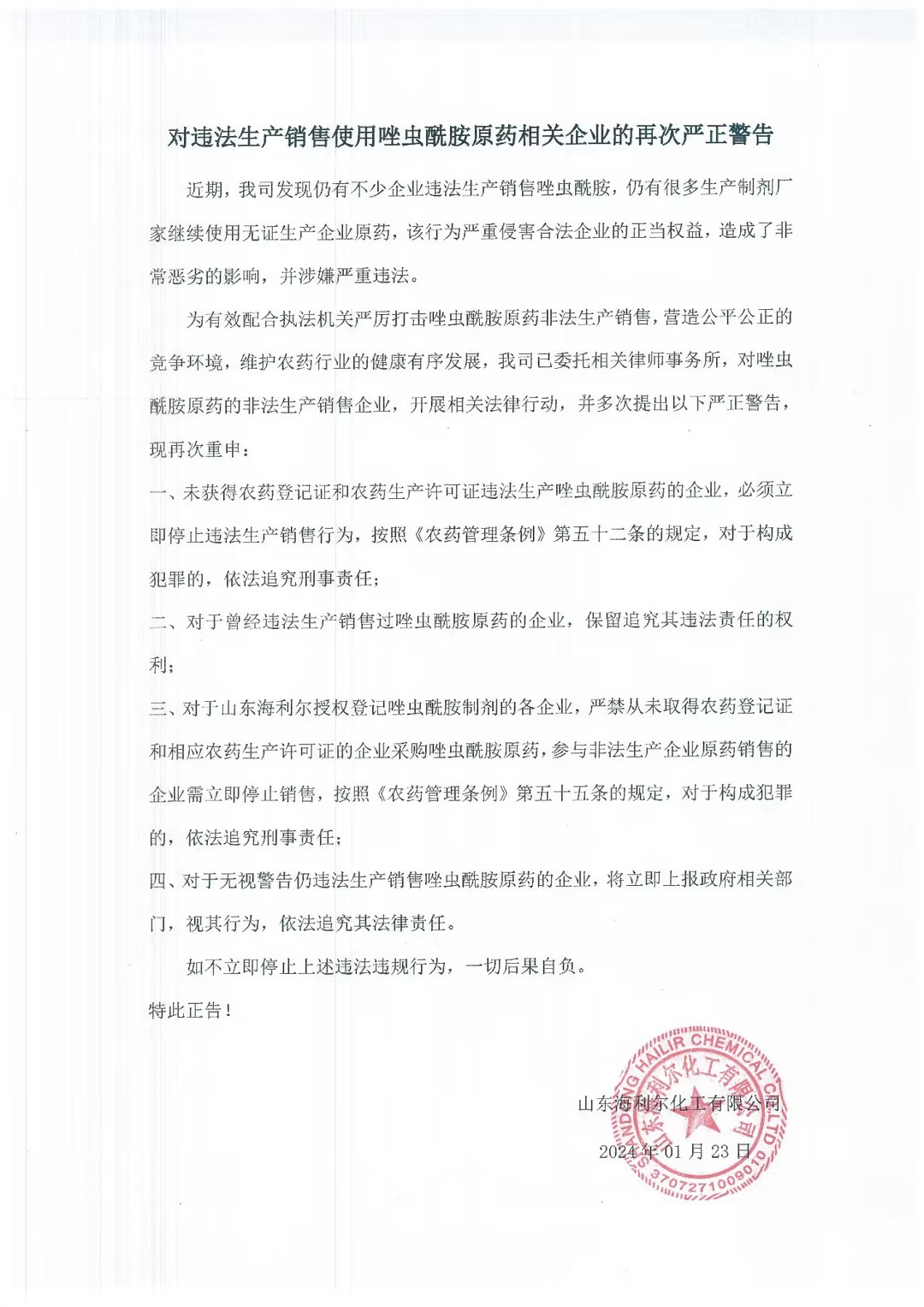 ? ? ? ?為有效配合執(zhí)法機(jī)關(guān)嚴(yán)厲打擊唑蟲酰胺原藥非法生產(chǎn)銷售,營造公平公正的競爭環(huán)境,維護(hù)農(nóng)藥行業(yè)的健康有序發(fā)展,我司已委托相關(guān)律師事務(wù)所,對唑蟲酰胺原藥的非法生產(chǎn)銷售企業(yè),開展相關(guān)法律行動,并多次提出以下嚴(yán)正警告,現(xiàn)再次重申: