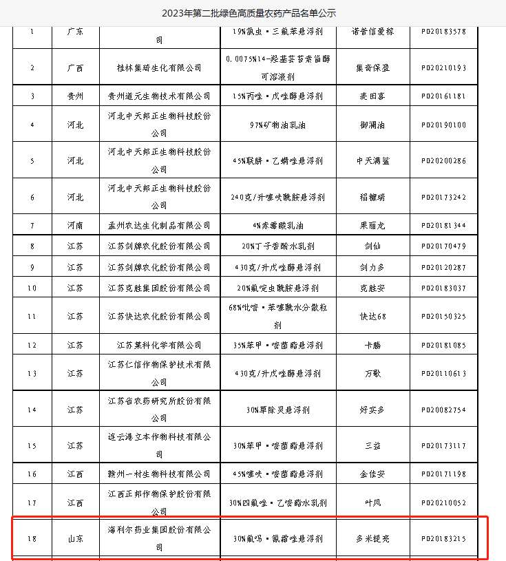 ? ? ? ? 參照T/CCPIA 170-2021《綠色高質(zhì)量農(nóng)藥產(chǎn)品評價規(guī)范》團體標(biāo)準(zhǔn)為基礎(chǔ),中國農(nóng)藥工業(yè)協(xié)會開展了綠色高質(zhì)量農(nóng)藥產(chǎn)品申報工作。最終,經(jīng)協(xié)會形式審查并組織專家綜合審定,由農(nóng)藥生產(chǎn)/經(jīng)營單位自愿申報的43個產(chǎn)品中有36個產(chǎn)品符合T/CCPIA 170-2021標(biāo)準(zhǔn)要求并進(jìn)入了“第二批綠色高質(zhì)量農(nóng)藥產(chǎn)品公示名單”。海利爾藥業(yè)集團股份有限公司專利產(chǎn)品多米提亮(有效成分:20%氟嗎啉 · 10%氰霜唑懸浮劑成功入圍名單。