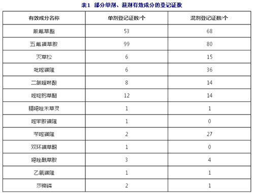 ??? 2018年水稻田除草劑登記數(shù)量部分見表1,從登記數(shù)量來看,單劑和混劑的登記數(shù)量相當(dāng)。