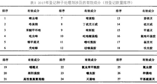 ??? 2017年新增登記的種子處理劑共涉及27種有效成分(表3),唑環(huán)菌胺、氯蟲苯甲酰胺等一批新品種已加入到種子處理產(chǎn)品的行列,產(chǎn)品結(jié)構(gòu)有了一定程度的優(yōu)化;共有登記配方50個(包括12種單劑產(chǎn)品),前10位的配方及其具體登記數(shù)量(表4),混配產(chǎn)品所占比重明顯增加;此外,毒性級別較高的農(nóng)藥品種已基本退出了舞臺。