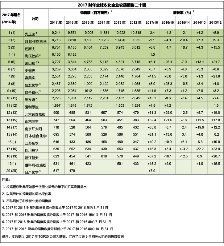位居該榜單第16位的江蘇揚(yáng)農(nóng),其美元計(jì)銷售額大幅飆升49.2%(2016:-10.9%), 同時(shí)也是該榜單增幅最高的公司。據(jù)悉,2017年,揚(yáng)農(nóng)化工核心客戶全部實(shí)現(xiàn)業(yè)績(jī)?cè)鲩L(zhǎng),其子公司江蘇優(yōu)嘉植物保護(hù)有限公司產(chǎn)品的登記和市場(chǎng)布局全面展開(kāi),麥草畏成為揚(yáng)農(nóng)化工第2個(gè)銷量過(guò)萬(wàn)噸的品種,菊酯類產(chǎn)品和麥草畏居于行業(yè)領(lǐng)先地位,進(jìn)而推動(dòng)揚(yáng)農(nóng)化工銷售和利潤(rùn)均創(chuàng)歷史新高。
