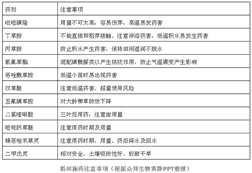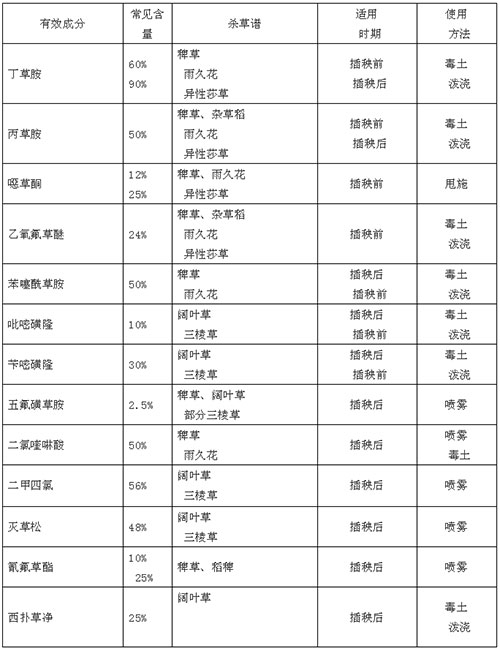 ??? 二是本田雜草防控,在雜草出土第一個高峰(泡田后7-10天)時,防治稻稗、雜草稻、扁桿?草、野慈姑、水綿;雜草出土第二個高峰(插秧后10-15天)時,防治雨久花、螢藺、眼子菜、小茨藻。