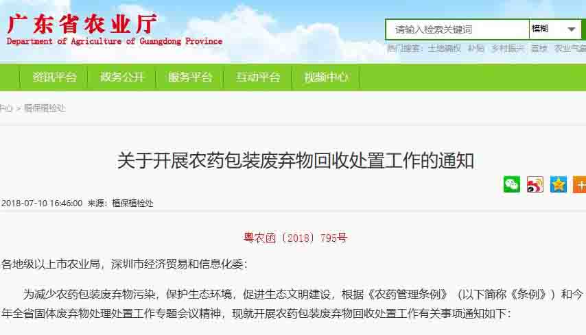 ? ? 日前,廣東省農(nóng)業(yè)廳發(fā)出《關(guān)于開(kāi)展農(nóng)藥包裝廢棄物回收處置工作的通知》,要求各級(jí)農(nóng)業(yè)部門嚴(yán)格執(zhí)法,加強(qiáng)農(nóng)藥包裝廢棄物回收的執(zhí)法監(jiān)管,將其列為農(nóng)業(yè)行政執(zhí)法的重要內(nèi)容。農(nóng)藥生產(chǎn)企業(yè)、農(nóng)藥經(jīng)營(yíng)者不履行農(nóng)藥廢棄物回收義務(wù)的,按有關(guān)規(guī)定予以嚴(yán)懲。