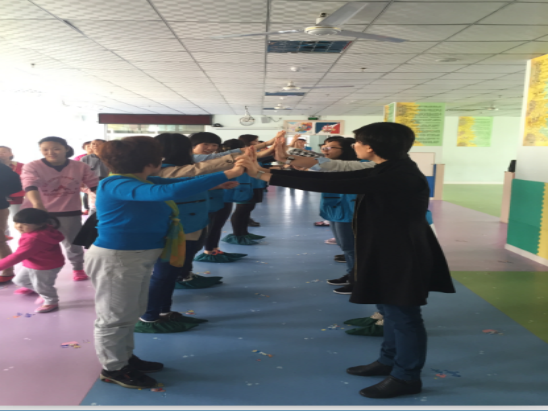 接下來就是“快樂的小火車”游戲,志愿者們主動搭起了“火車軌道”。