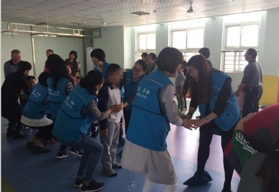 走到二樓活動室,正好趕上他們互動游戲課程,這些孩子對陌生人都有一定的抵觸感,所以在老師的引導下,志愿者們通過簡單的互動、自我介紹、擁抱等方式建立了初步友誼,小朋友們慢慢的笑起來。